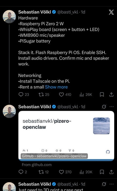 @basti_vkl built a handheld OpenClaw device on a Raspberry Pi Zero 2W — screen, mic, speaker, battery, 3D-printed case incoming. The physical form factor of a personal agent.