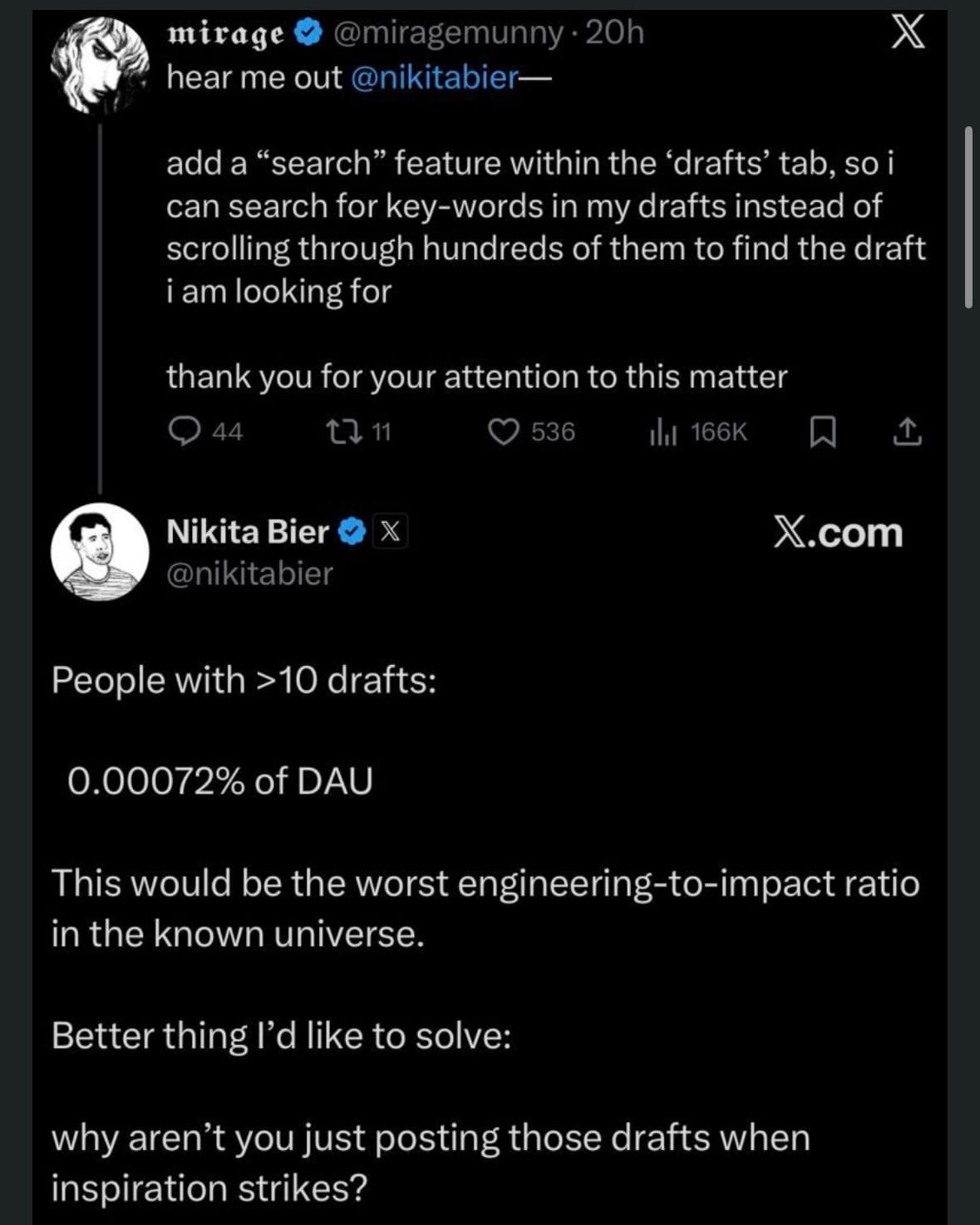 Nikita's response: people with more than 10 drafts represent 0.00072% of DAU. "This would be the worst engineering-to-impact ratio in the known universe." Then, the actual question: why aren't you posting those drafts when inspiration strikes?