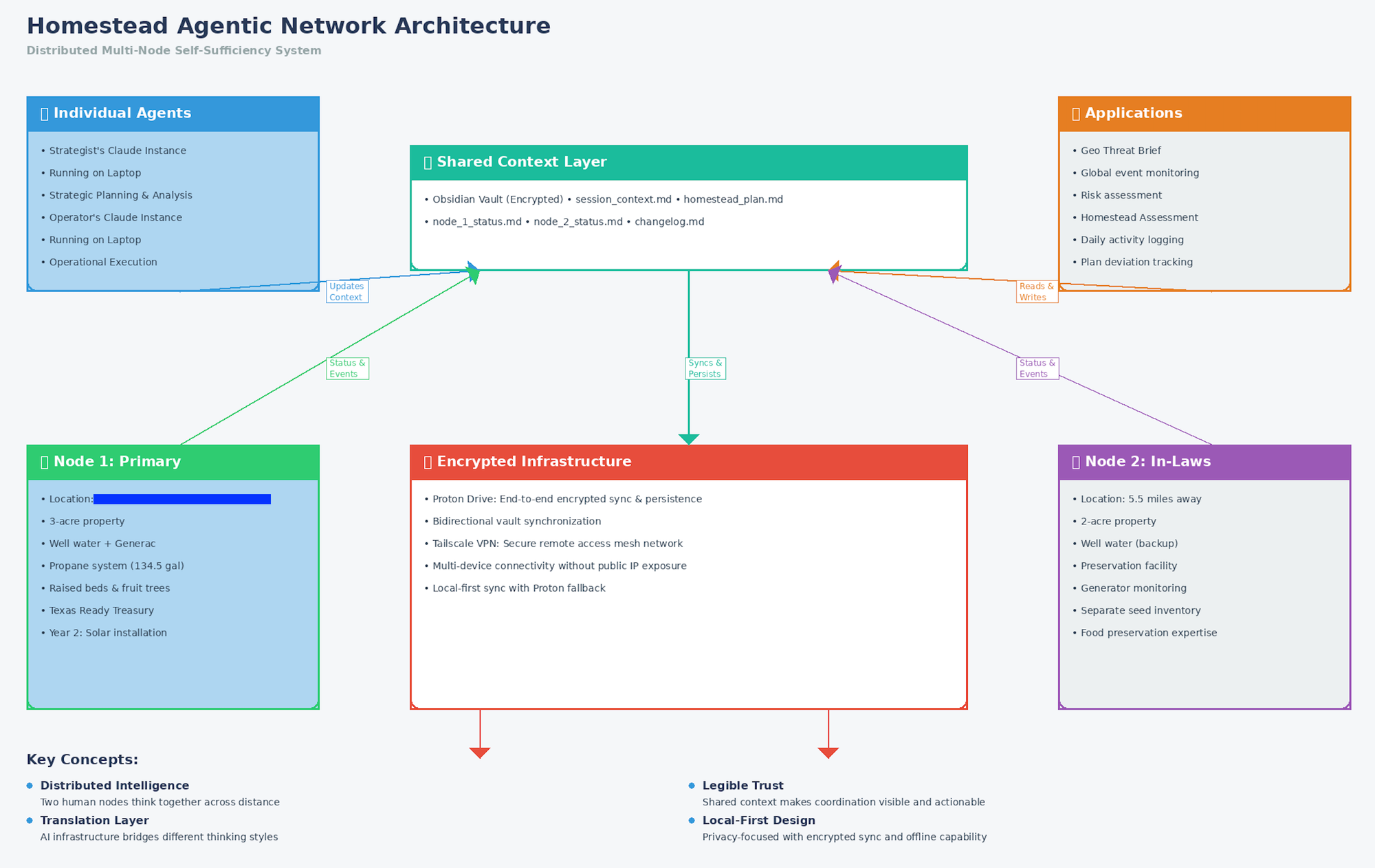 We plan to build separate Claude instances for each household (node). They both feed into the shared context layer. An Obsidian vault encrypted on Proton Drive, this time with Tailscale and local model processing. Eventually we may expand this to a longer term storage but the unique capabilities of Obsidian outweigh the switch for now. The AI is holding shared context across physical distance. It's helping translate between strategic thinking and operational constraint - it is a Node in and of itself. It's infrastructure that lets two different households work at the same problem without losing coherence.
